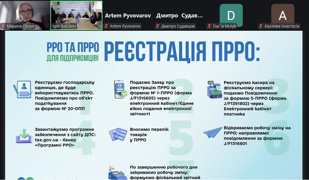 Під час заходу учасники розглянули ключові питання ведення підприємницької діяльності, зокрема особливості вибору загальної або спрощеної системи оподаткування для ФОП, порядок сплати податків і зборів та строки їх внесення, можливості подання звітності через електронні сервіси Державної податкової служби України. Окрему увагу було приділено практичним аспектам використання електронного кабінету платника податків, умовам обов’язкового застосування РРО/ПРРО та відповідальності за порушення вимог законодавства.