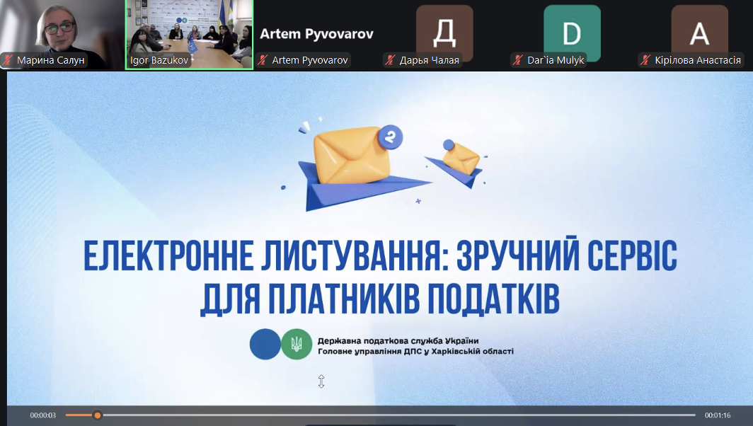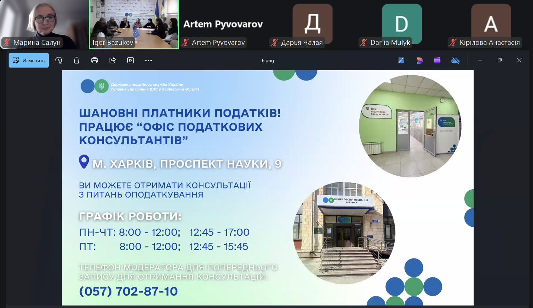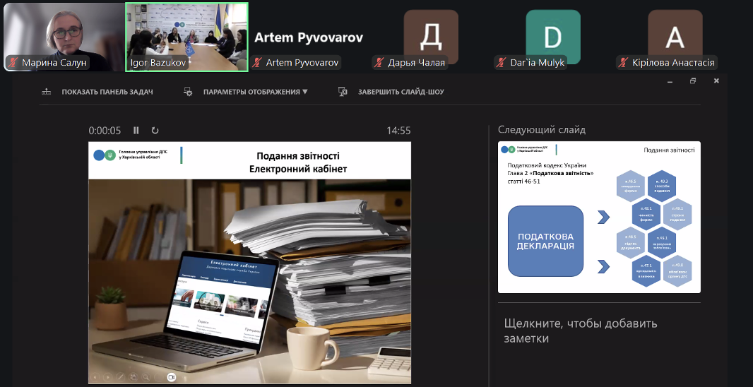Спікерами семінару виступили представники Головного управління ДПС у Харківській області: Бєлушкіна Інна Леонідівна – головний державний інспектор відділу адміністрування податків і зборів з фізичних осіб управління оподаткування фізичних осіб; Путятіна Олена Василівна – головний державний інспектор відділу фактичних перевірок управління податкового аудиту; Скрипниченко Марина Володимирівна – начальник відділу податкових сервісів управління податкових сервісів; Волобуєва Олександра Федорівна – начальник відділу інформаційної взаємодії.