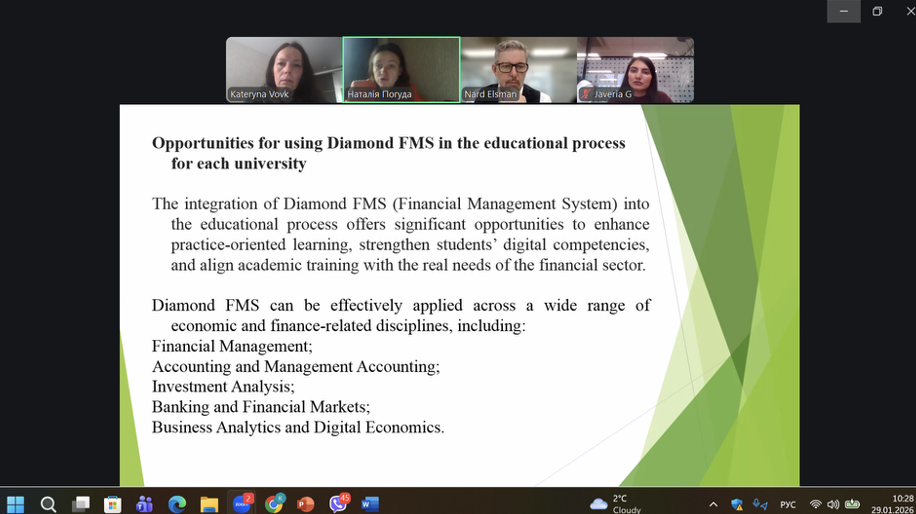 29 січня 2026 року відбулася онлайн-зустріч із представниками компанії Diamond FMS (https://www.diamond-fms.com(sad) директором Нардом Ельсманом (https://www.facebook.com/nard.elsmansr?locale=uk_UA) та керівницею проєкту Джаверією Джафар (https://www.facebook.com/Javeria.Gha?locale=uk_UA).