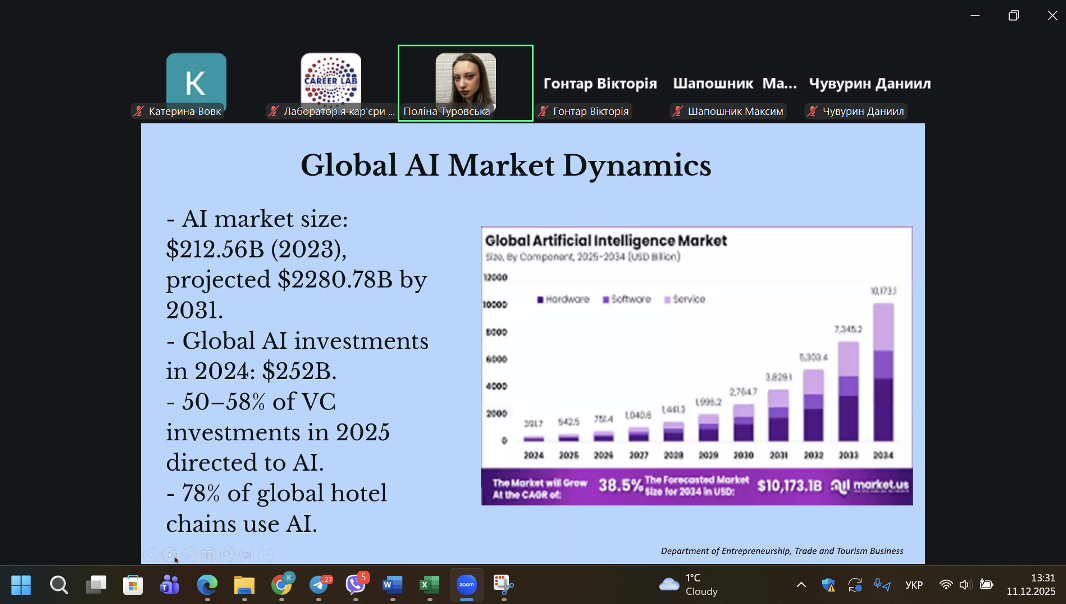 У своїх виступах студентки показали, як український бізнес може стати більш конкурентоспроможним навіть у складних умовах завдяки впровадженню інструментів штучного інтелекту. Особлива увага була приділена туристичним дестинаціям та тому, як інноваційні технології ШІ допомагають їм розвиватися та залучати більше гостей.